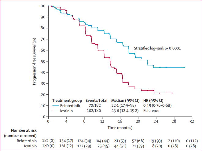 研究结果表明,贝福替尼组(182例)的中位随访时间为20.7个月,埃克替尼组(180例)为19.4个月。贝福替尼组由IRC评估的中位PFS为22.1个月,显著优于埃克替尼组13.8个月(HR 0.49,P<0.0001)。