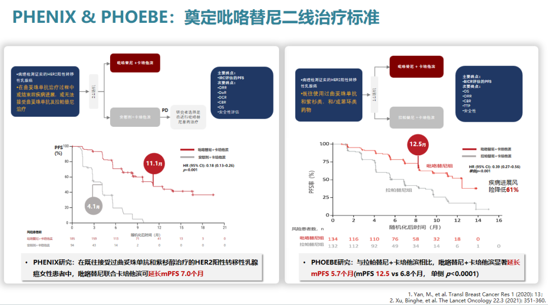 PHENIX研究[4]结果提示,在既往接受过曲妥珠单抗和紫杉醇治疗的HER2阳性转移性乳腺癌女性患者中,吡咯替尼联合卡培他滨可延长mPFS 7.0个月(11.1个月vs 4.0个月);在PHOEBE[5]研究中,与拉帕替尼+卡培他滨相比,吡咯替尼+卡培他滨显著延长mPFS 5.7个月(mPFS 12.5 vs 6.8个月,单侧P<0.0001),PHENIX研究和PHOEBE研究两项Ⅲ期临床研究的优异结果共同奠定了吡咯替尼+卡培他滨成为晚期HER2阳性乳腺癌二线治疗的标准方案。