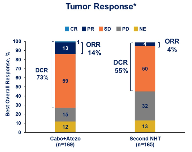 在疾病控制方面,卡博替尼联合阿替利珠单抗组的ORR(14%vs.4%)、DCR(73%vs.55%)均更优。但联合治疗组的任何级别不良反应及3/4级不良反应比例高于对照组,而5级不良反应则低于对照组(9%vs.12%)。两组治疗停药率类似。