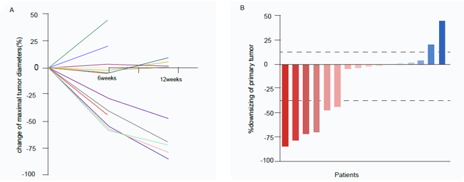 图2.肿瘤缓解蜘蛛图(A)和瀑布图(B)
