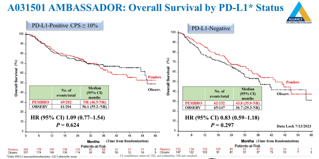 AMBASSADOR研究是一项开放标签、随机、III期试验,纳入了经组织学证实的膀胱、上尿路或尿道MIUC患者,这些患者:(1)接受了NAC,且手术(根治性膀胱切除术、肾切除术、肾输尿管切除术或输尿管切除术)后病理显示≥pT2和/或pN+或切缘+;或者(2)没有接受过NAC,术后病理未pT3和/或pN+或切缘+。入组患者不能耐受顺铂或拒绝基于顺铂的辅助治疗,在手术后≥4至16周登记入组,按照1:1的比例随机接受帕博利珠单抗(200 mg,每3周一次,持续1年)辅助治疗或观察(Obs)。根据病理分期、中心检测的PD-L1状态和既往NAC对随机分组进行分层。研究设置双主要终点,包括无病生存期(DFS)和总生存期(OS),目标样本量为739例,最终分析需要387例DFS和320例OS事件。次要终点包括评估PD-L1阳性和阴性患者的DFS和OS,以及安全性。此处报告中期DFS和OS结果。
