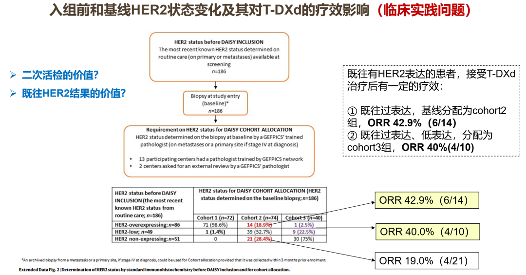 II期临床研究联合生物标志物探索是近年产出高分文章的研究模式。DAISY研究也采用类似模式,其主要目的包括探索T-DXd药物的作用机制、受益患者群及耐药相关生物标志物。由于HER2异质性的存在,既往HER2过表达患者在DAISY研究基线二次活检后分配到HER2低表达组或HER2 IHC 0组均能从T-DXd中取得约40%的ORR,提示二次活检或既往HER2中出现HER2过表达或低表达即有潜力从T-DXd治疗中获益。