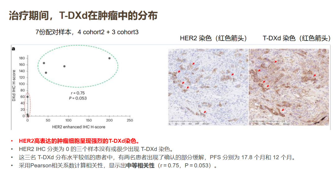 在T-DXd于肿瘤中分布与疗效的相关性方面。在治疗期间共匹配了4例HER2低表达、3例HER2 IHC 0的样本。研究显示HER2高表达的肿瘤细胞呈现强烈的T-DXd染色,HER2 IHC 0几乎无T-DXd染色,T-DXd在肿瘤中分布与疗效呈现中等相关性。
