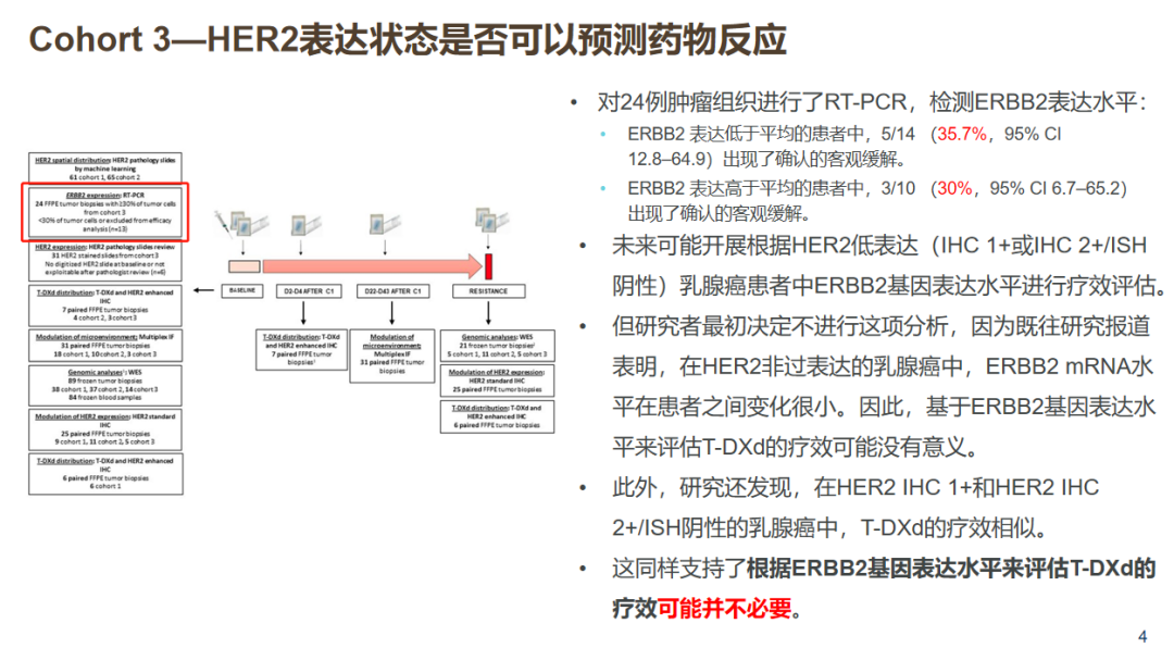 在HER2表达模式和治疗有效性方面。研究者对HER2 IHC0表达组的24例肿瘤组织进行了RT-PCR,并检测基线ERBB2表达水平,未发现ERBB2基因表达水平与T-DXd的相关性。