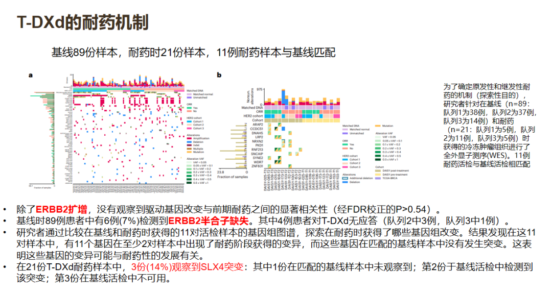 在耐药性方面,DAISY研究采用了全外显子基因测序分析(WES)。结果显示,除ERBB2扩增外,原发性耐药与基因表达间无直接关系。在21份T-DXd耐药样本中,3份(14%)观察到SLX4突变。进一步探索发现在SLX4沉默的细胞中,DXd的80%有效浓度(IC80)增加,提示了该基因与T-DXd耐药性存在相关性。
