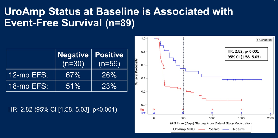 Dr.Marie-Pier St-Laurent:Our study,derived from SWOG 1605,investigated urine tumor DNA(utDNA),aiming to determine if this test could predict recurrence in patients treated with atezolizumab for BCG-unresponsive NMIBC.Our findings revealed that patients testing positive for utDNA at baseline were almost three times more likely to experience recurrence within 12 and 18 months compared to those testing negative.Interestingly,this test helped identify minimal residual disease(MRD)in patients showing no disease via cystoscopy and cytology but having high tumor mutations in their urine.This could guide further investigations,such as bladder biopsies,to detect recurrences not identified by current standard methods.