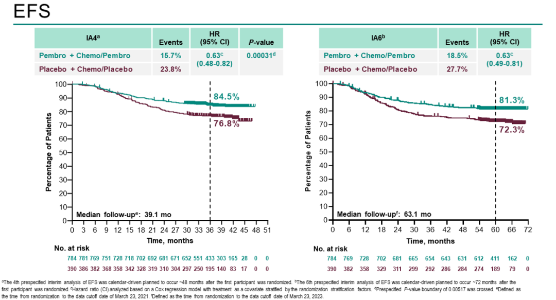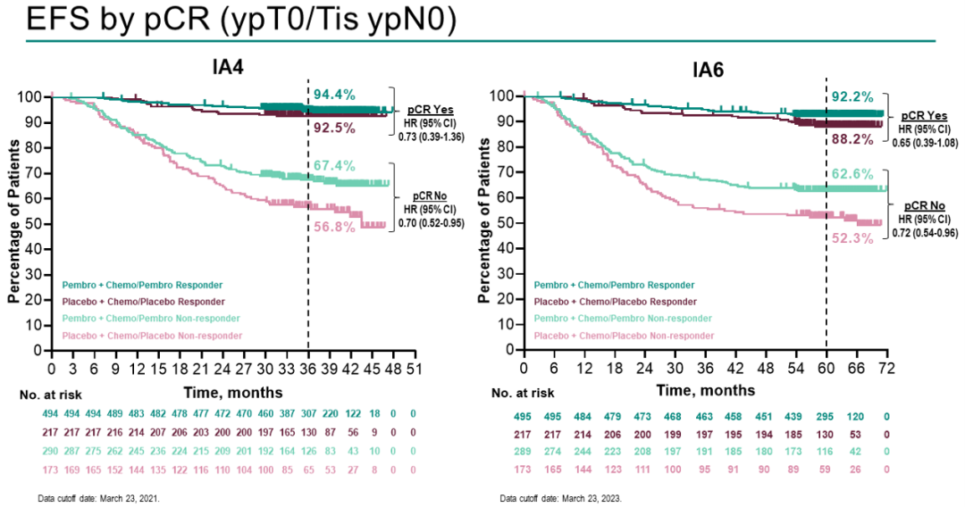KEYNOTE-522既往数据结果显示,新辅助化疗中加用帕博利珠单抗显著提高了早期TNBC患者的pCR率。2022年3月,中位随访39.1个月的数据显示,帕博利珠单抗组患者的EFS有统计学意义和临床意义的改善。2023年ESMO大会上,KEYNOTE-522中位随访63.1个月的数据公布,结果显示,在帕博利珠单抗组中,145例患者(18.5%)发生EFS事件,而在安慰剂组有108例患者(27.7%)(HR 0.63;95%CI:0.49~0.81)发生EFS事件。与安慰剂组相比,帕博利珠单抗对高危早期TNBC患者继续显示出有临床意义的EFS改善。无论PD-L1表达和淋巴结受累情况如何,EFS获益基本一致。在预先设定的、非随机化探索性分析中,帕博利珠单抗组和安慰剂组的5年EFS率分别为92.2%和88.2%(达到pCR患者),62.6%和52.3%(未达到pCR患者)。总生存期(OS)随访仍在进行中。