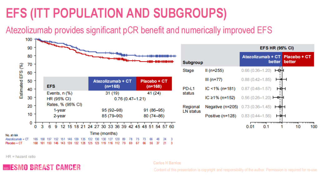 IMpassion 031是一项全球多中心、随机、双盲的Ⅲ期临床试验,旨在评估阿替利珠单抗联合化疗在早期TNBC新辅助治疗中的疗效和安全性。2023年ESMO BC大会上,IMpassion 031研究最终分析数据公布。结果显示,无论患者的PD-L1表达状况如何,阿替利珠单抗联合化疗方案均可以提高患者的pCR率、EFS、DFS和总生存期OS,改善患者的生存预后,且安全性良好。