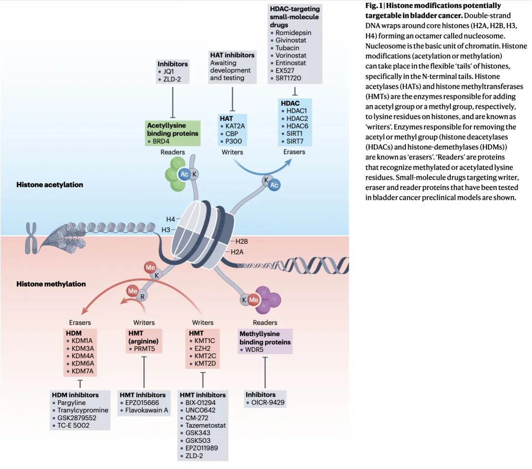 传统的肿瘤治疗研究主要关注DNA序列改变(如基因突变、基因重排和拷贝数变异等)。与DNA序列中的发生永久性变化不同,通过修饰改变对染色质结构的灵活调整具有可逆的潜力。这种区别是表观遗传调控的基本特征,为潜在的“表观遗传疗法”奠定了基础。靶向功能增强的突变可以通过直接抑制进行干预,目前已经开发了许多小分子抑制剂,如组蛋白去乙酰化酶(HDAC)抑制剂、组蛋白甲基转移酶(HMT)抑制剂、BET抑制剂。靶向功能缺失的突变一直是我们面临的挑战,而在膀胱肿瘤中,结合大规模的测序结果推断,这些突变也恰恰可能是膀胱肿瘤发生的驱动因素。目前靶向缺失突变的主要手段包括:合成致死,靶向拮抗性调节因子等。临床前研究提示:单独靶向某一组蛋白修饰因子在膀胱肿瘤中有治疗效果,靶向组蛋白修饰因子联合其他治疗策略(例如AR抑制剂,PARP抑制剂或者其他组蛋白修饰因子的抑制剂)值得关注。在本研究中,作者总结了处于临床前研究阶段用于靶向膀胱肿瘤中组蛋白修饰异常的小分子化合物、治疗靶点及研究模型。