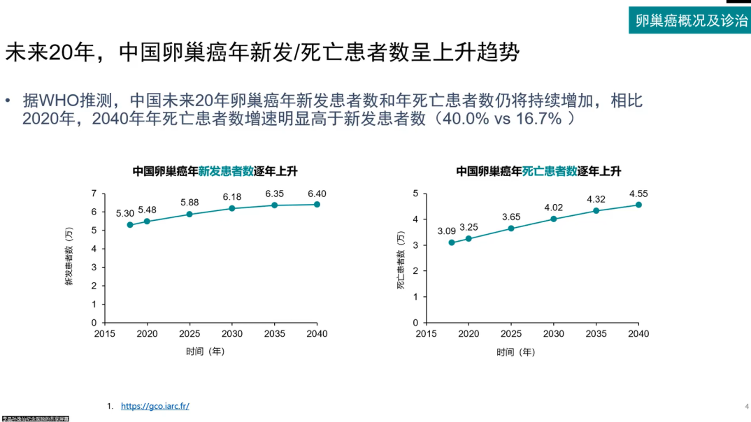 流行病学调查数据显示,卵巢癌是世界上第三大常见的妇科恶性肿瘤[1],在我国病死率位于女性生殖道恶性肿瘤之首[2],严重威胁我国女性的健康。鉴于其严峻的危害,美国癌症协会(ACS)每年都会估计美国的新发癌症病例和死亡人数,并汇编基于人群的癌症发生和结局的最新数据。2022年美国癌症协会预估美国将发生19880例新诊断卵巢癌病例,12810例死亡病例。年死亡与新发患者数比率高达64.4%[3]。据世界卫生组织(WHO)推测[4],中国未来20年卵巢癌的年新发患者数和年死亡患者数仍呈上升趋势。随着老龄化的加重,相比2020年,2040年年死亡患者数增速将明显高于新发患者数,形势十分严峻。