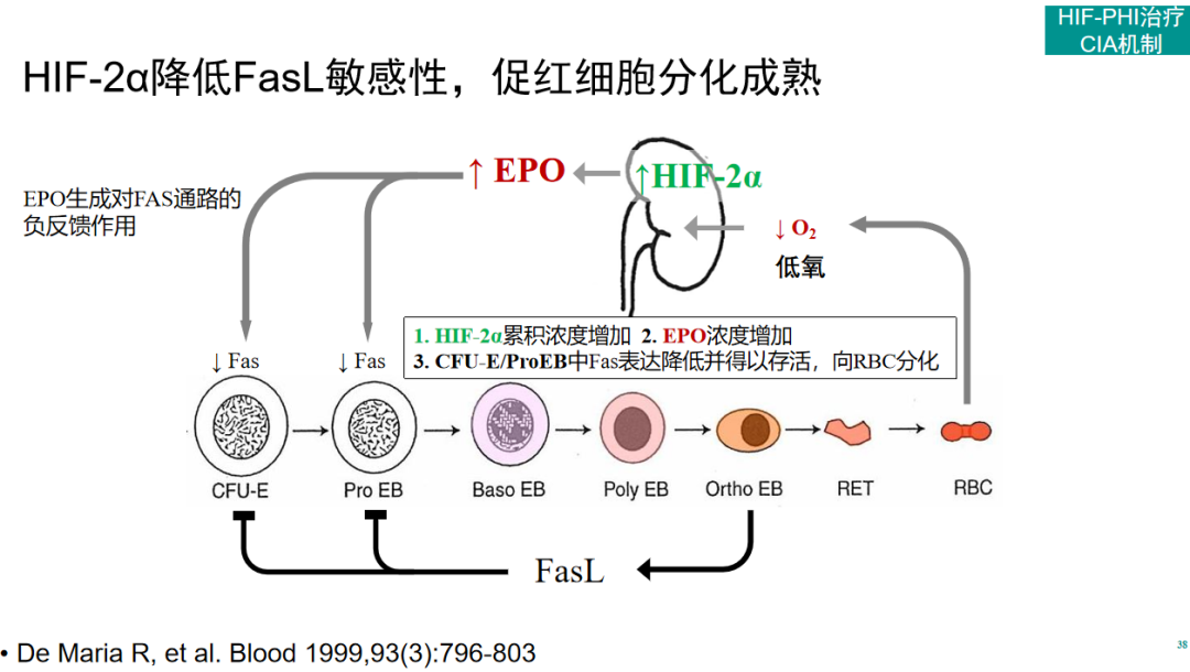 造血干细胞(HSC)生活在低氧的骨髓龛中,以保持静止状态[20]。HIF-1α是HSC生成和功能的调节剂,研究发现可以利用HIF-PHI稳定HIF-1α蛋白,促进HSC动员[21]。在促红细胞分化成熟方面。细胞因子或炎症因子能够增加未成熟红细胞FAS敏感性,可能会改变EPO和FAS/FasL之间的平衡,对红细胞生成不利。而HIF-PHI会模拟低氧环境,提升HIF-2α水平,进而降低FasL敏感性,并使EPO浓度增加,促红细胞分化成熟[22]。