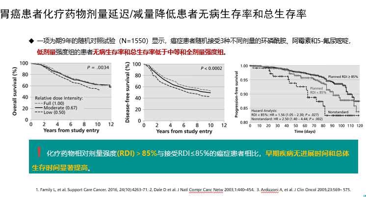 胃癌对化疗的如期按量给药有较强的需求,化疗药物剂量延迟/减量会降低患者无病生存(PFS)率和总生存(OS)率。一项为期9年的随机对照研究显示,使用环磷酰胺、阿霉素和5-氟尿嘧啶方案的胃癌患者,当相对剂量强度(RDI)<85%时,患者PFS率较RDI≥85%的患者有极大下降,且低剂量化疗组的PFS和OS均劣于中剂量组和高剂量组[8,9,10]。