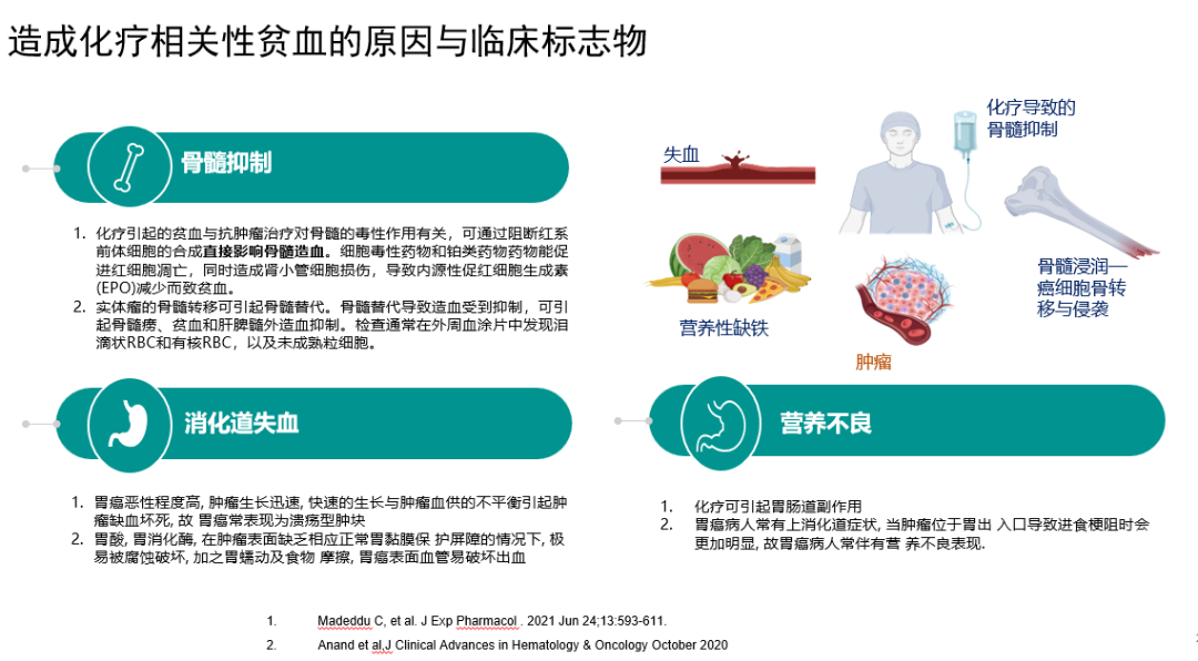 肿瘤患者发生贫血的原因很多,首当其冲的就是各种因素引起的骨髓抑制,一方面化疗会促使进红细胞凋亡、造成肾小管损伤,从而使得人体内促红细胞生成素(EPO)生产不足而贫血,另一方面实体瘤的骨髓转移会引起骨髓替代,抑制骨髓造血功能而诱发贫血。其次是消化道失血,肿瘤的快速生长与难以为继的血供平衡会导致肿瘤坏死、破溃、出血;胃癌组织结构改变,缺乏黏膜覆盖,容易在胃酸、消化酶等的作用下破溃,也会造成出血。再次,化疗引起的消化道毒性会导致患者食欲减退,引起营养不良,使患者体内红细胞增值速度降低,导致贫血的发生[16,17]。