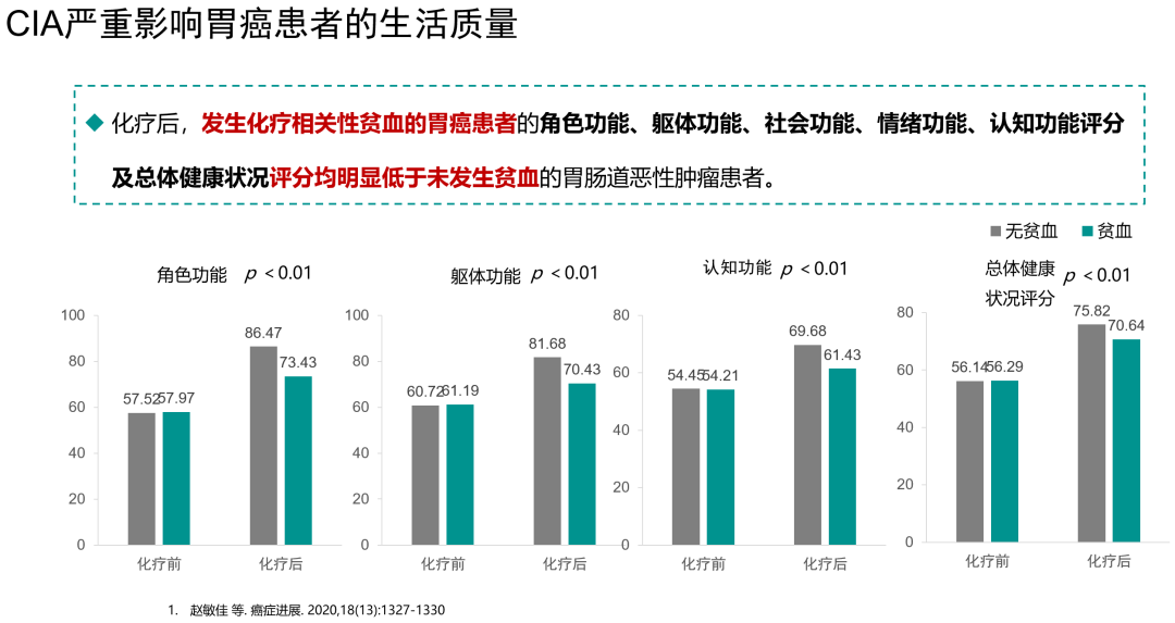 值得注意的是,通过防治CIA,可改善患者生存状况。在对胃癌患者使用卡培他滨+伊立替康(XI)以及卡培他滨+顺铂(XP)方案一线治疗时,若在治疗期间为患者予以EPO-b,则较未处理的患者改善DCR和OS[15]。因此,需在临床中积极防控CIA。