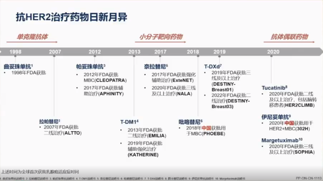 HER2阳性乳腺癌患者抗HER2治疗的发展历程:自曲妥珠单抗上市以来,HER2阳性乳腺癌患者的治疗日新月异,单克隆抗体、小分子靶向药物、抗体偶联药物犹如“三驾马车”,为HER2阳性乳腺癌患者的治疗“保驾护航”。早期HER2阳性乳腺癌的(新)辅助治疗也由过去的单一模式(化疗联合曲妥珠单抗)转变为精准医学时代下的个体化治疗(升阶梯:高危患者双靶治疗/T-DM1强化;降阶梯:低危患者去蒽环化疗)。HER2靶向治疗也显著改善了晚期乳腺癌患者的生存。
