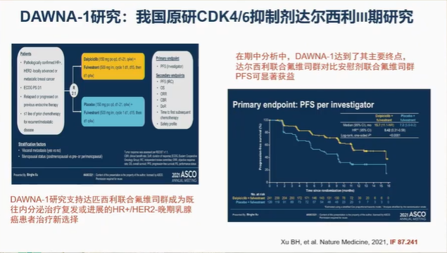 DAWNA-1研究是我国原研CDK4/6抑制剂达尔西利的Ⅲ期研究,在期中分析中,DAWNA-1达到了其主要终点,达尔西利联合氟维司群对比安慰剂联合氟维司群PFS可显著获益,DAWNA-1研究支持达尔西利联合氟维司群成为既往内分泌治疗复发或进展的HR+/HER2-晚期乳腺癌患者治疗新选择。在2021年ASCO大会上,徐兵河院士进行了口头报道,随后,该研究结果发表于Nature Medicine。