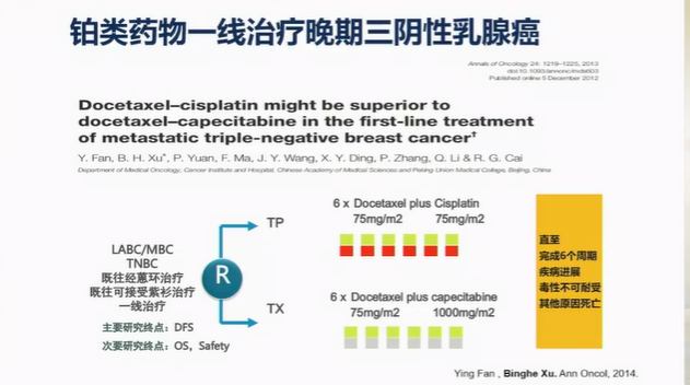 徐兵河院士团队开展的小样本、随机对照的一线治疗晚期TNBC患者的研究结果显示,TP治疗效果优于TX。复旦大学附属肿瘤医院与中国医学科学院肿瘤医院等共同开展的随机对照的Ⅲ期CBCSG006研究明确了含铂化疗方案在mTNBC的重要地位,相关结果发表于Lancet Oncology,含铂方案成为转移性TNBC一线治疗新选择,基于中国研究者的研究结果,德国和中国乳腺癌诊疗指南推荐含铂方案作为转移性TNBC患者的标准一线治疗。