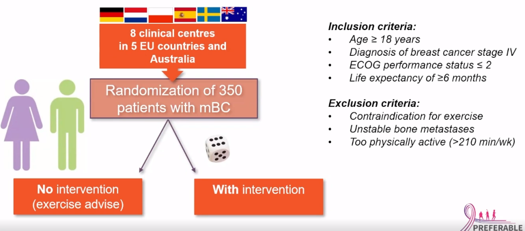 PREFERABLE-EFFECT研究包括约350名平均年龄在55岁左右的转移性乳腺癌患者。患者是在德国、波兰、西班牙、瑞典、荷兰和澳大利亚的八家癌症中心之一招募的。在这些患者中,178人被随机选择参加为期9个月的锻炼计划,同时接受常规护理,另外179人则接受常规护理。