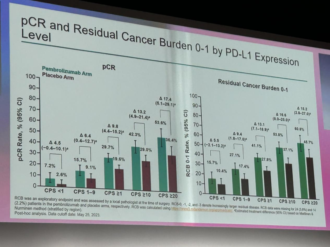 该研究根据患者ER阳性细胞表达<10%或≥10%进行了分层。发现ER+<10%的患者中,64.7%(22/34)接受帕博利珠单抗治疗的患者RCB状态为0-1,而接受安慰剂治疗的患者RCB状态为0-1的比例为37.2%(16/43)。在ER≥10%的患者中,33.3%(200/601)接受帕博利珠单抗治疗的患者RCB状态为0-1,而接受安慰剂治疗的患者RCB状态为0-1的比例为22.7%(136/600)。