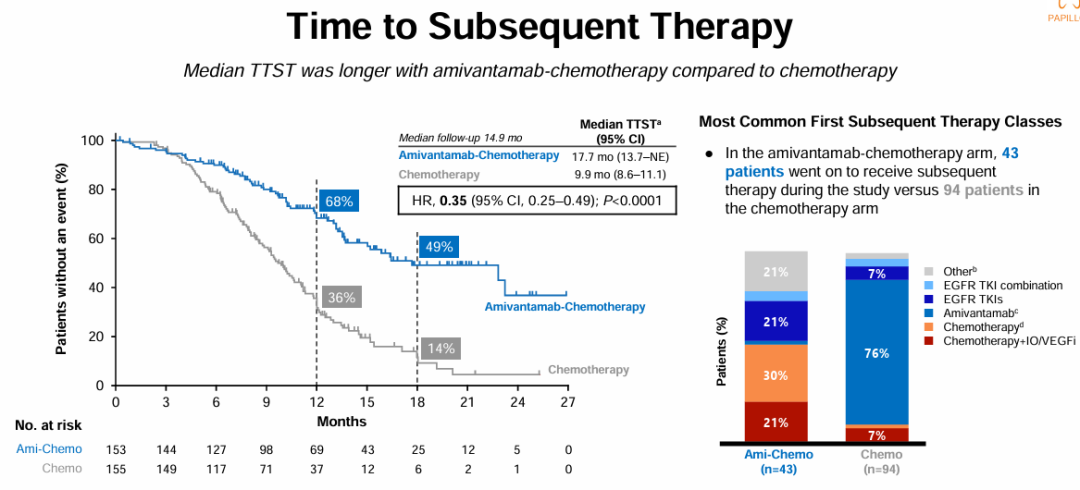 PAPILLON研究既往结果显示,EGFR-MET双特异性抗体Amivantamab+化疗(卡铂-培美曲塞)vs化疗一线治疗显著延长EGFR ex20ins突变晚期NSCLC的无进展生存(PFS),中位PFS为11.4个月vs 6.7个月(HR=0.395,P<0.0001),18个月PFS率为31%vs 3%。2024 ELCC展示的PAPILLON研究进展后结果显示,中位随访14.9个月时,联合治疗的中位至治疗终止时间(TTD)为13.2个月(95%CI:11.8-15.2),单独化疗为7.5个月(95%CI:7.0-8.4)(HR=0.38;95%CI:0.28-0.51;P<0.0001);在12个月和18个月时,Amivantamab+化疗组分别有58%和35%的患者仍在接受治疗,而单独化疗组的对应数据仅为21%和5%。联合治疗组的中位至后续治疗时间(TTST)为17.7个月(95%CI:13.7-不可评价[NE]),单独化疗组为9.9个月(95%CI:8.6-11.1)(HR=0.35;95%CI:0.25-0.49;P<0.0001)。在12个月和18个月时,联合治疗组分别有68%和49%的患者未接受后续治疗,而单独化疗组分别有36%和14%的患者未接受后续治疗。