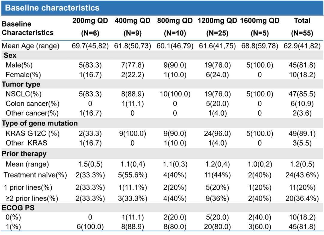 截止于2023年12月,研究总计纳入了55例实体瘤患者,其中包括49例为KRAS G12C突变。49例患者中43例为NSCLC,5例为肠癌,1例为胰腺癌。所有接受了400 mg QD或更高剂量的患者,中位持续用药时间为7.0个月(95%CI:5.7~8.5)。患者基线状态如下表1所示: