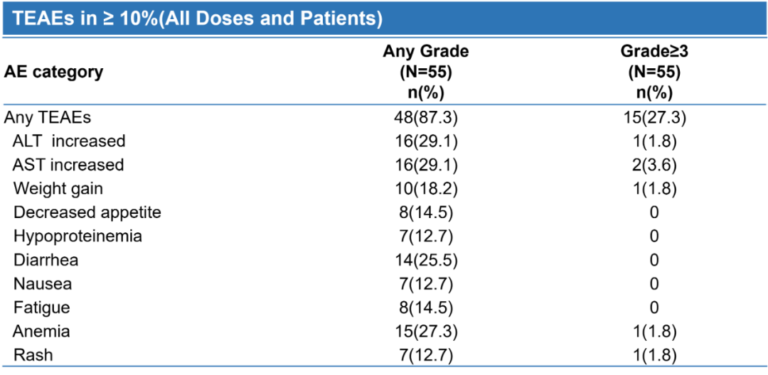 安全性方面,未观察到剂量限制性毒性(DLT),也未达到最大耐受剂量(MTD)。55例患者中87.3%在治疗期间发生了不良反应(TEAEs),≥3级TEAEs的发生率为27.3%。导致剂量减少或中止的TEAEs发生率分别为18.2%和1.8%,≥3级的肝酶升高的比例非常低(ALT升高1.8%;AST升高3.6%)。发生率≥10%的TEAEs如下表2所示: