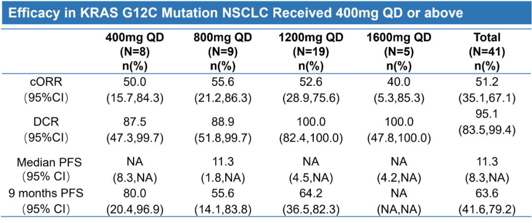 表3.400 mg QD或更高剂量的KRAS G12C NSCLC患者疗效表现
