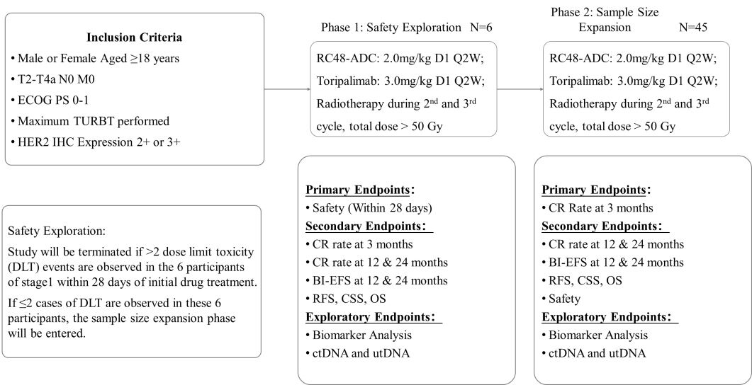 这是一项两阶段的开放标签、单臂、多中心研究,旨在评估DV联合特瑞普利单抗和放疗作为HER2过表达MIBC的保膀胱治疗。本研究将招募约51名患者,其中6名患者将进入第一阶段进行DLT安全性研究,45名患者将进入第二阶段作为扩展队列进行疗效和安全性研究。