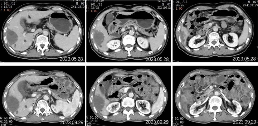 患者为77岁高龄男性,确诊肝内胆管细胞癌时伴有肝内和肺部的多发转移。经过4疗程的斯鲁利单抗联合GP方案治疗后,虽然影像学检查肿瘤缩小未能达到PR的状态,但腹部增强CT示肿瘤的活性以及外周血中的肿瘤标志物均明显下降,考虑抗肿瘤治疗有效。但患者因为高龄,不能耐受长期的化疗,虑及暂停治疗进展风险较,选择斯鲁利单抗联合安罗替尼维持治疗,以期尽可能的延长患者的PFS,同时兼顾患者的耐受性,改善生活质量。经过一段时间的维持治疗,患者的病情稳定,生活质量良好,PFS时间为13.5个月。后来患者肺部转移病灶出现缓慢进展,患者拒绝更换方案,并要求继续安罗替尼维持治疗,目前OS已经超过20个月。总体而言,通过免疫治疗、化疗及抗血管靶向治疗的联合应用,该患者取得了不错的治疗效果。