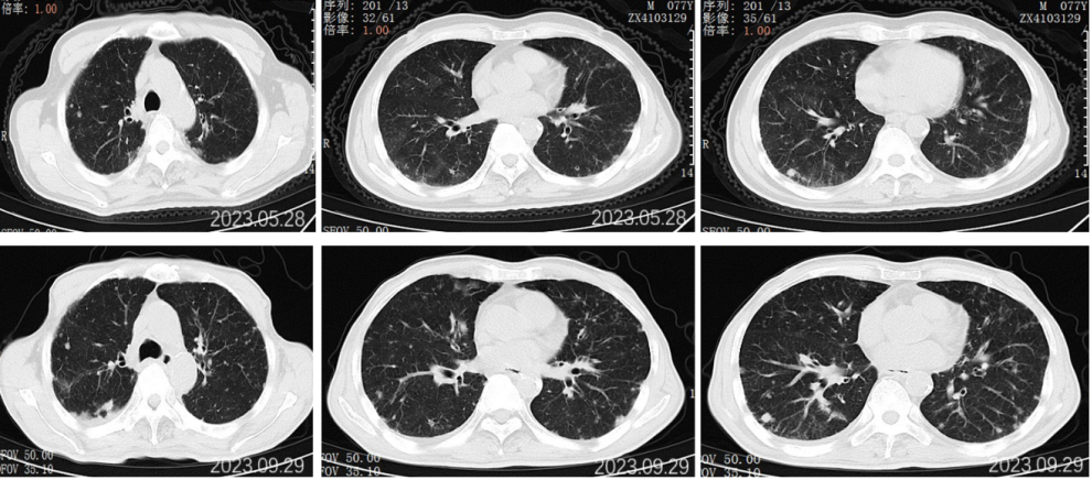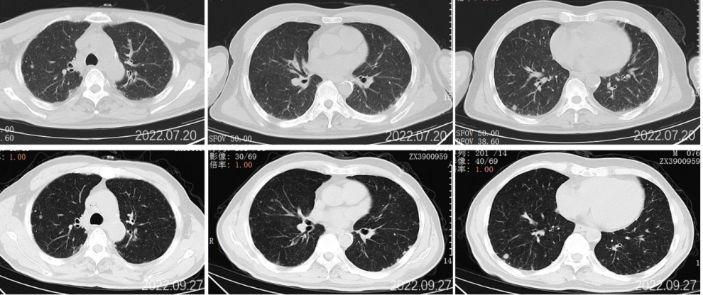 2023.09.29我科门诊复查,肺部转移灶较前增大、增多,为肺部转移性病灶的缓慢进展,并且无明显临床症状,建议患者完善基因检测,继续行二线治疗,但患者及家属治疗意愿不强,目前安罗替尼继续维持治疗中。
