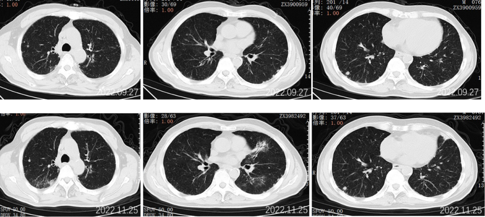 2022.11.25胸部CT平扫:对比2022-09-27影像:1.新见两肺多发间质性肺炎样改变,感染考虑,VP-RADS 2类;2.两肺多发小结节、类结节影,部分较前略缩小,转移性考虑;3.左侧第5后肋骨质破坏,相仿。