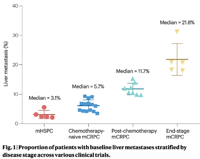 前列腺癌肝转移的患病率随疾病进展而增加,从最初的转移性激素敏感性前列腺癌(mHSPC)的约3%上升到治疗后的转移性去势抵抗性前列腺癌(mCRPC)的超过20%。此外,肝转移与肺转移的比例也从最初mHSPC的1:3上升到治疗后mCRPC的1:1以上。