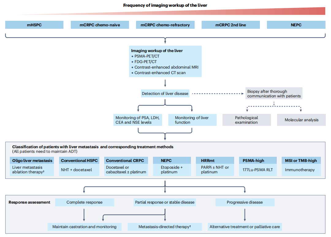 前列腺癌肝转移诊断-治疗-随访体系:在论文中作者发布了复旦大学附属肿瘤医院多学科团队制定的前列腺癌肝转移诊断-治疗-随访体系。转移性前列腺癌患者通过影像学检查以检测肝转移。通常选择两种影像学方法进行互相验证,包括PSMA PET-CT、FDG PET-CT、增强腹部核磁共振成像或增强CT。具体的影像学检测方法由医生与患者沟通后确定。一旦发现可疑肝转移病灶,建议患者进行转移病灶的靶向活检以确认肿瘤转移,并对转移病灶进行基因检测。无论患者选择是否进行转移病灶活检,在随后的时间段内,患者将接受血清前列腺特异性抗原(PSA)、乳酸脱氢酶(LDH)、癌胚抗原(CEA)和神经元特异性烯醇酶(NSE)水平以及肝功能的密切随访监测。基于综合影像结果、病理学发现、基因检测结果和前列腺癌分期,医生将选择最适合患者的治疗方案,同时保持雄激素剥夺疗法(ADT)。