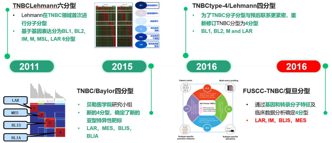 为深入剖析TNBC的生物学特征,对于TNBC进一步的分子分型在不断发展,复旦大学附属肿瘤医院邵志敏教授团队于2016年提出了著名的中国复旦四分型(FUSCC-TNBC),包括基底样免疫抑制型(BLIS)、免疫调节型(IM)、腔面雄激素受体型(LAR)、间质型(MES)。