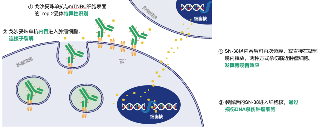 SG作为全球首个且唯一获批用于治疗不可切除的局部晚期或转移性TNBC的Trop-2 ADC,可精准靶向Trop-2受体,可裂解的连接子可在肿瘤微环境和肿瘤细胞中裂解释放细胞毒载荷,发挥双重旁观者效应,进一步提升抗肿瘤活性[14]