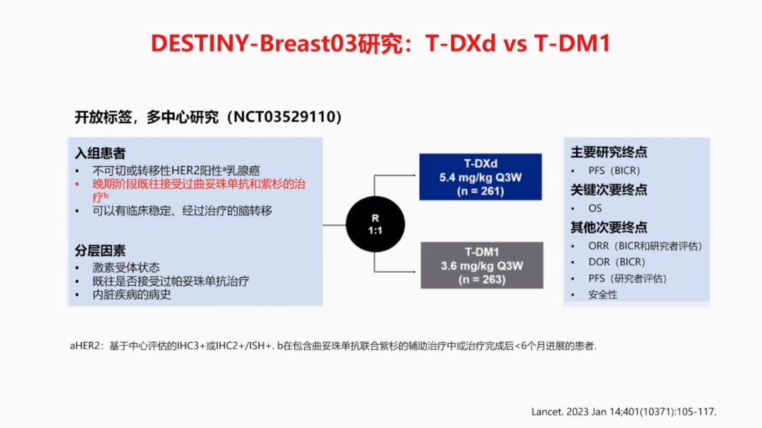 近年来随着新型ADC药物的出现,使患者的临床获益有了大幅提升。大家较为熟悉的DESTINY-Breast03研究是一项全球性的、随机、开放标签的头对头临床Ⅲ期试验[2,3],头对头比较了T-DXd与T-DM1在既往接受曲妥珠单抗和紫杉烷类药物治疗的HER2阳性不可切除和/或转移性乳腺癌患者中的安全性和有效性。