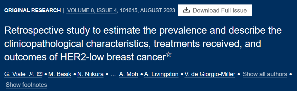 原文:Viale G,Basik M,Niikura N,et al.Retrospective study to estimate the prevalence and describe the clinicopathological characteristics,treatments received,and outcomes of HER2-low breast cancer[J].ESMO open,2023,8(4):101615.https://www.ncbi.nlm.nih.gov/pmc/articles/PMC10515285/