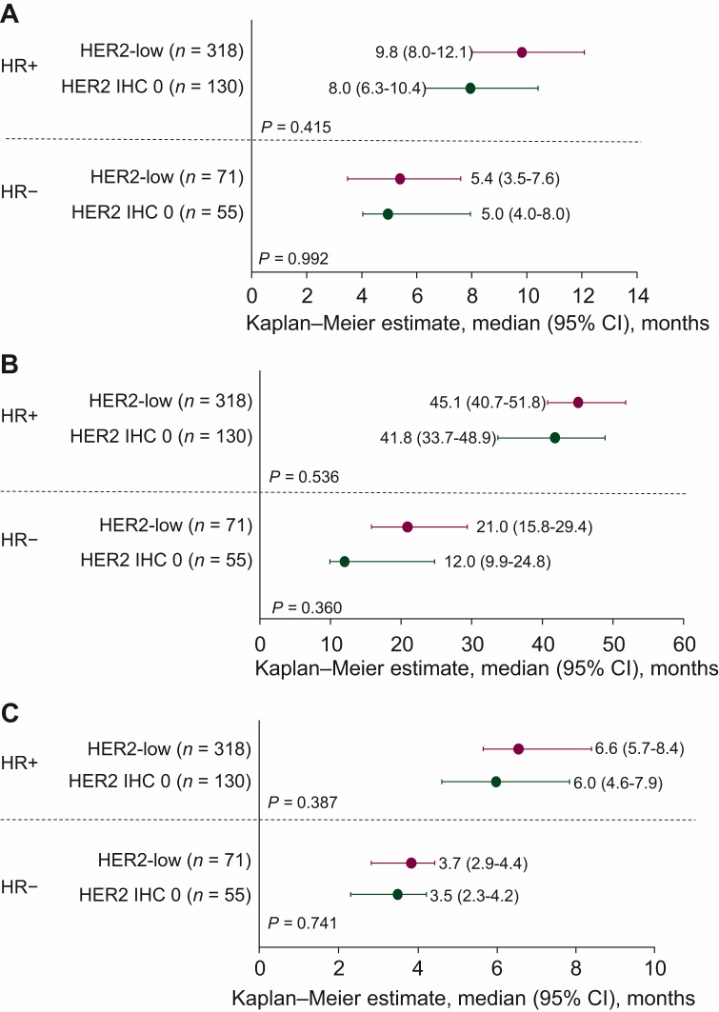 图1各HR亚组中HER2低表达和HER2 IHC 0状态的临床结局