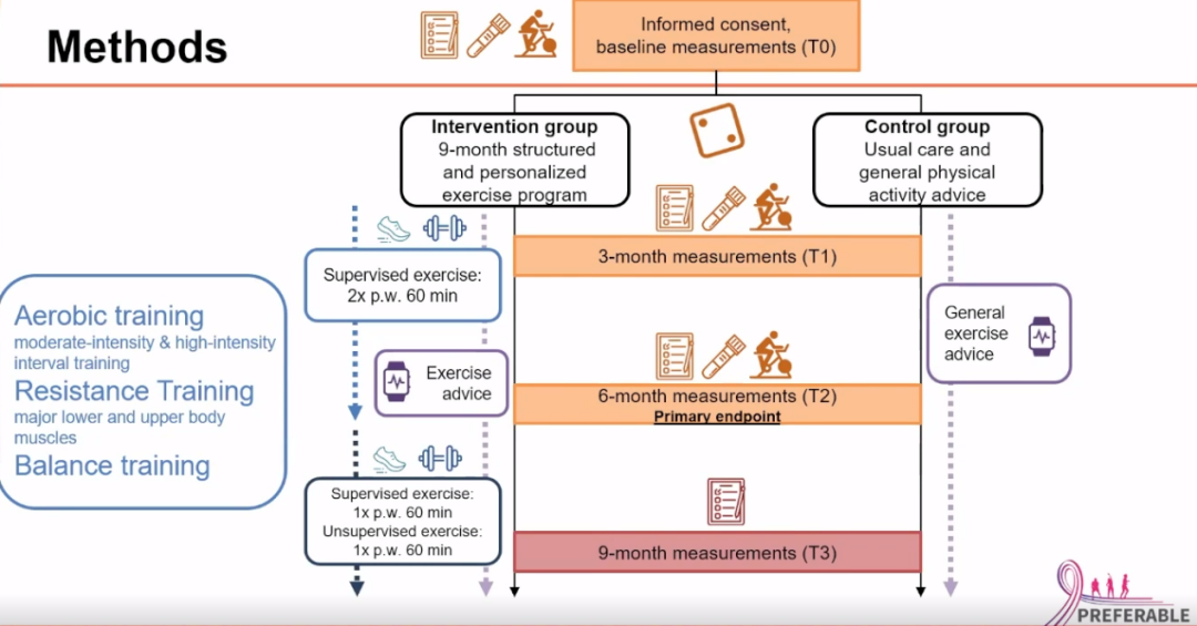 So the last couple of decades,a lot of research has been done in the field of exercise oncology,which has led to several guidelines,including the ASCO and ACSM guidelines,showing that exercise has beneficial effects on cardiorespiratory fitness,fatigue and quality of life.But this research has mainly been conducted in the curative cancer setting.So that’s also why they highlighted that more research needs to be done in patients with metastatic breast cancer.And that’s where the PREFERABLE-EFFECT study came in.The primary aim of the PREFERABLE-EFFECT study was to investigate the effects of exercise in patients with metastatic breast cancer on quality of life and fatigue.