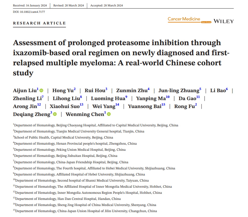 1.Liu,Aijun et al.Assessment of prolonged proteasome inhibition through ixazomib-based oral regimen on newly diagnosed and first-relapsed multiple myeloma:A real-world Chinese cohort study.Cancer medicine vol.13,9(2024):e7177.