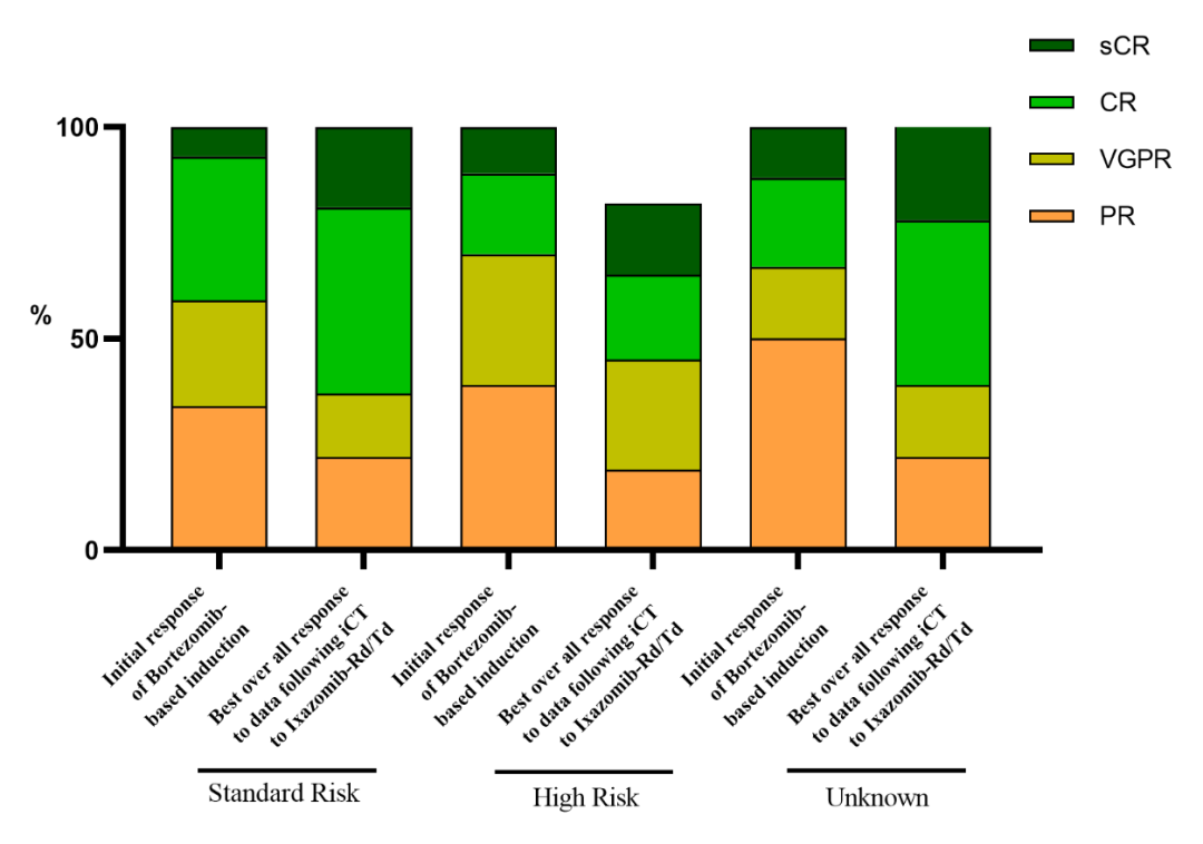 转换为伊沙佐米方案后,标准风险队列的sCR和CR率分别上升至18%和43%,VGPR和PR率分别下降至14%和21%;高风险队列的sCR和CR率分别上升至17%和20%,VGPR和PR率分别下降至26%和19%。至于未知风险队列,转换为伊沙佐米治疗后,sCR率从12%增加到23%,CR率从21%增加到39%,PR率从50%下降到22%(图2)。