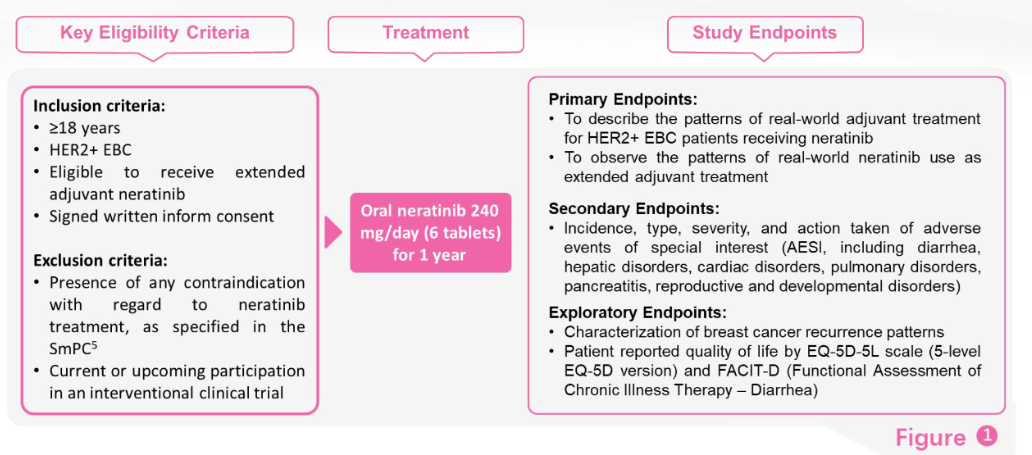 张瑾教授:NER-Tree研究入选了2024年ESMO大会壁报展示,该研究为多中心、开放标签、单臂、非干预性研究,评价了早期乳腺癌患者应用奈拉替尼进行强化辅助治疗的效果。NER-Tree研究纳入了中国30个中心500例完成曲妥珠单抗辅助治疗并计划接受1年奈拉替尼延长辅助治疗的HER2阳性早期乳腺癌患者,患者将接受12个月的奈拉替尼延长辅助治疗和12个月随访。主要和次要目标是描述真实世界辅助治疗模式,并观察奈拉替尼治疗患者的安全性。