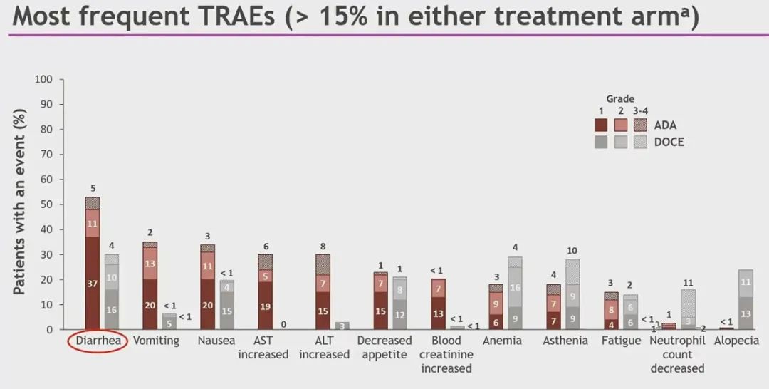 Adagrasib和多西他赛组最常见的TRAE包括腹泻、呕吐、恶心、AST升高、ALT升高、食欲下降、血肌酐升高、贫血、虚弱、疲劳、中性粒细胞计数减少和脱发。