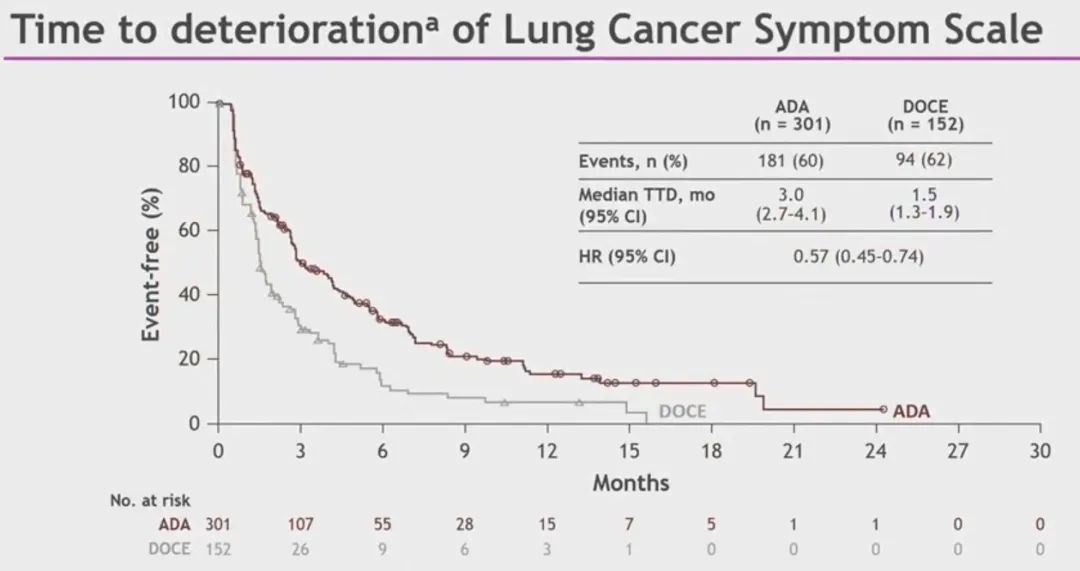 • Adagrasib将中位PFS延长至5.5个月,而多西他赛为3.8个月,将疾病进展风险降低了42%。