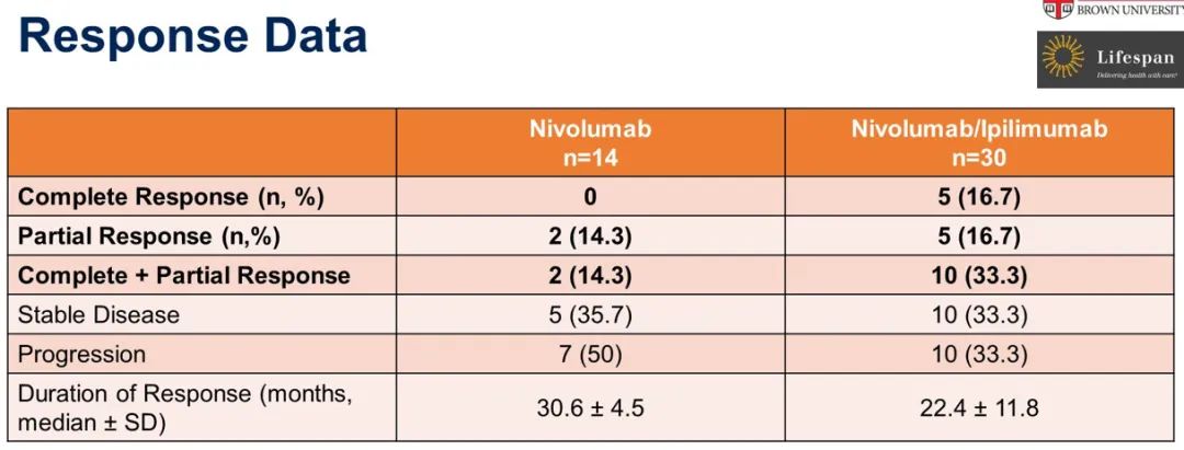 BrUOG 354试验的主要结果是,纳武利尤单抗组的ORR约为14.3%,其中包括两名患者达到部分缓解,但没有患者出现完全缓解。联合伊匹木单抗的方案使缓解率飙升至33.3%,其中包括5名完全缓解的患者。