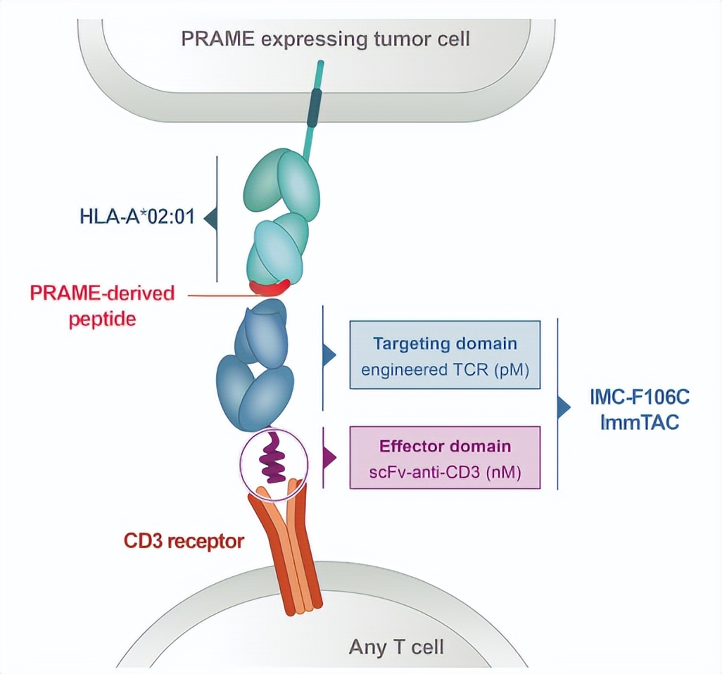 IMC-F106C是一种通过ImmTAX平台开发的双特异性蛋白,靶向PRAME抗原。PRAME(Preferentially Expressed Antigen of Melanoma)是一种在黑色素瘤细胞中高度表达的肿瘤相关抗原,属于癌-睾丸抗原(Cancer-testis antigen,CTA)家族,广泛存在于肺癌、卵巢癌、乳腺癌等多种肿瘤细胞中。IMC-F106C通过其TCR部分识别呈递了黑色素瘤内部PRAME多肽的HLA-A*02:01分子,另一端的CD3部分则连接T细胞的CD3受体,使T细胞能够识别肿瘤细胞并发挥抗肿瘤免疫作用。这一机制不仅能够精准地靶向肿瘤细胞,还能减少对正常组织的损伤,提高治疗的特异性和安全性。