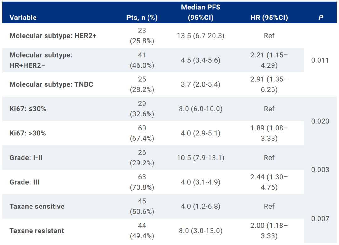 结果显示,89例患者的ORR为22.5%,疾病控制率(DCR)较高,达到84.3%,总人群mPFS达到6个月。单因素分析显示,HER2+患者、Ki-67<30%患者、紫杉醇敏感患者、1-2线治疗的晚期乳腺癌患者、存在部分缓解的患者的PFS更长。值得强调的是HER2+患者较HR+/HER2-、TNBC的mPFS更长,为13.5 vs.4.5 vs.3.7个月,P=0.011,其中HER2+患者多为一线抗HER2治疗失败人群,HR+/HER2-多为CDK4/6i经治后进展人群。安全性方面,艾立布林及其联合方案的主要不良反应为血液学毒性,包括白细胞减少、中性粒细胞减少等,而外周神经毒性发生较少。