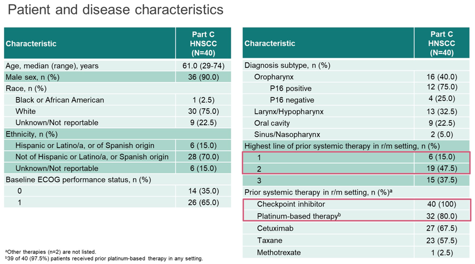 截至2023年9月6日,HNSCC治疗40例,其中39例(97.5%)患者既往接受过铂类治疗。在r/m HNSCC中,25例(62.5%)患者接受了≤2线全身治疗(中位数:2;范围:1~3),40(100%)患者既往接受过CPI,23例(57.5%)患者接受过既往紫杉烷治疗,27例(67.5%)患者接受过既往西妥昔单抗治疗。诊断时最常见的亚部位是口咽部(N=16,其中12个p16阳性)、喉部(N=10)和口腔(N=9)。
