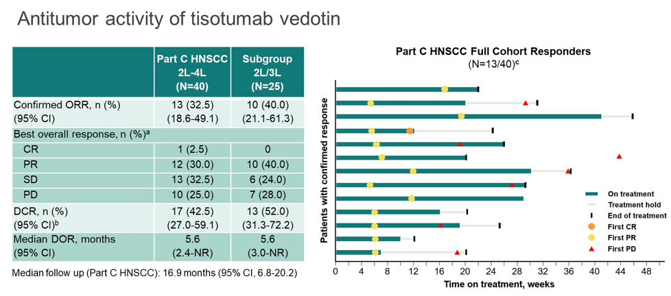 innovaTV207是一项开放标签、全球、Ⅱ期、多队列、多中心研究,评估TV单药治疗或联合治疗晚期实体瘤。在C部分中,r/m HNSCC的患者接受TV单药治疗(1.7 mg/kg IV Q2W)。所有患者都必须接受过基于铂类的方案,无论是在r/m HNSCC中,还是在基于铂类的放化疗和检查点抑制剂(CPI)后有持续性疾病(如果符合条件)的患者中。主要终点是确认每位研究者的客观缓解率(cORR)。次要终点包括缓解持续时间(DOR)、缓解时间(TTR)和安全性。