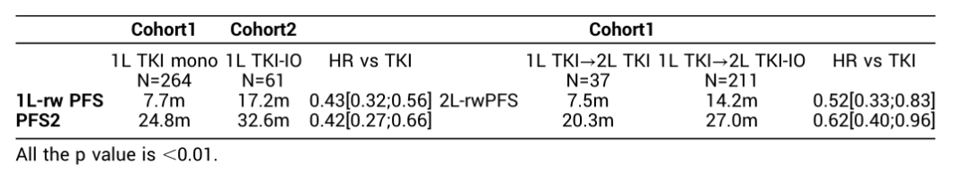 共纳入325例患者,中位年龄为55岁(16~83岁),男性75%(244例),女性25%(81岁)。在队列1中,264例患者接受了1L TKI,队列2中,61例患者接受了1L TKI-IO治疗。队列1的中位1L-rwPFS为7.7个月,队列2为17.2个月(HR 0.43,95%CI:0.32~0.56,P<0.00001),其中所有患者,最常用的TKI单药治疗是舒尼替尼,对于TKI-IO,组合最多的是阿昔替尼+替雷利珠单抗注射液。TKI-IO的中位PFS2更长(32.6 vs.24.8个月)(HR 0.42,95%CI:0.27~0.66],P<0.00001)。在队列1中,37例患者进展后选择2线TKI单药治疗,而211例患者接受TKI-IO,2L TKI-IO的2L-rwPFS更长(14.2 vs.7.5个月;HR 0.52,95%CI:0.33~0.83,P=0.00043),PFS2也有类似趋势(20.3 vs.27个月;HR 0.62,95%CI:0.40~0.96,P=0.0095)。在211例2L TKI-IO队列患者中,最多方案的是阿昔替尼+IO(182/211),阿昔替尼+IO和其他TKI+IO的中位2L-rwPFS分别为15.2个月和8.2个月(HR 0.41,95%CI:0.23~0.72],P<0.00001)。